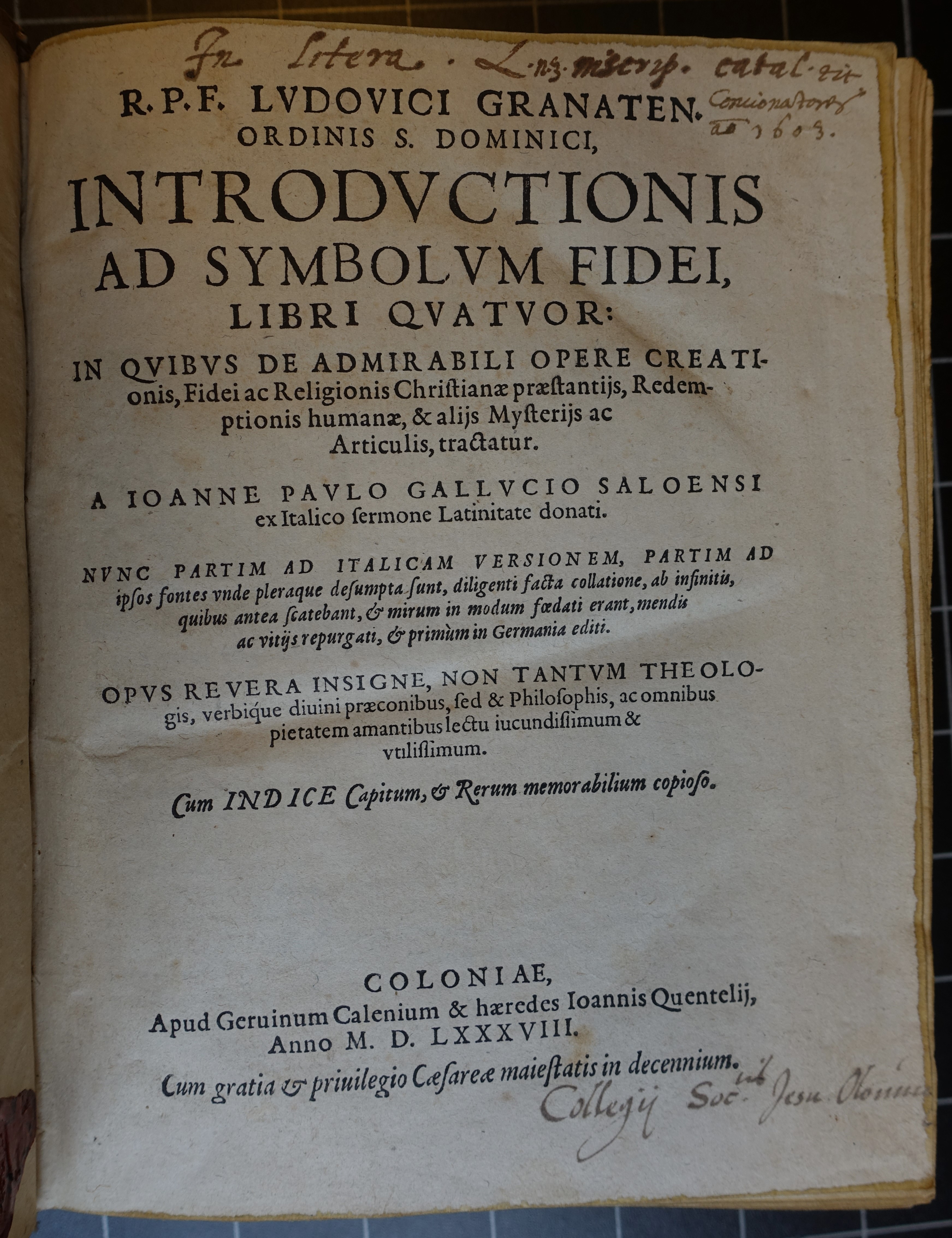 Rukopisné exlibris In litera L. n. 3 script. catal. Tit. Concionatores a[nn]o 1603. Collegij Soc[ieta]tis Jesu Olomuc. (titulní strana)