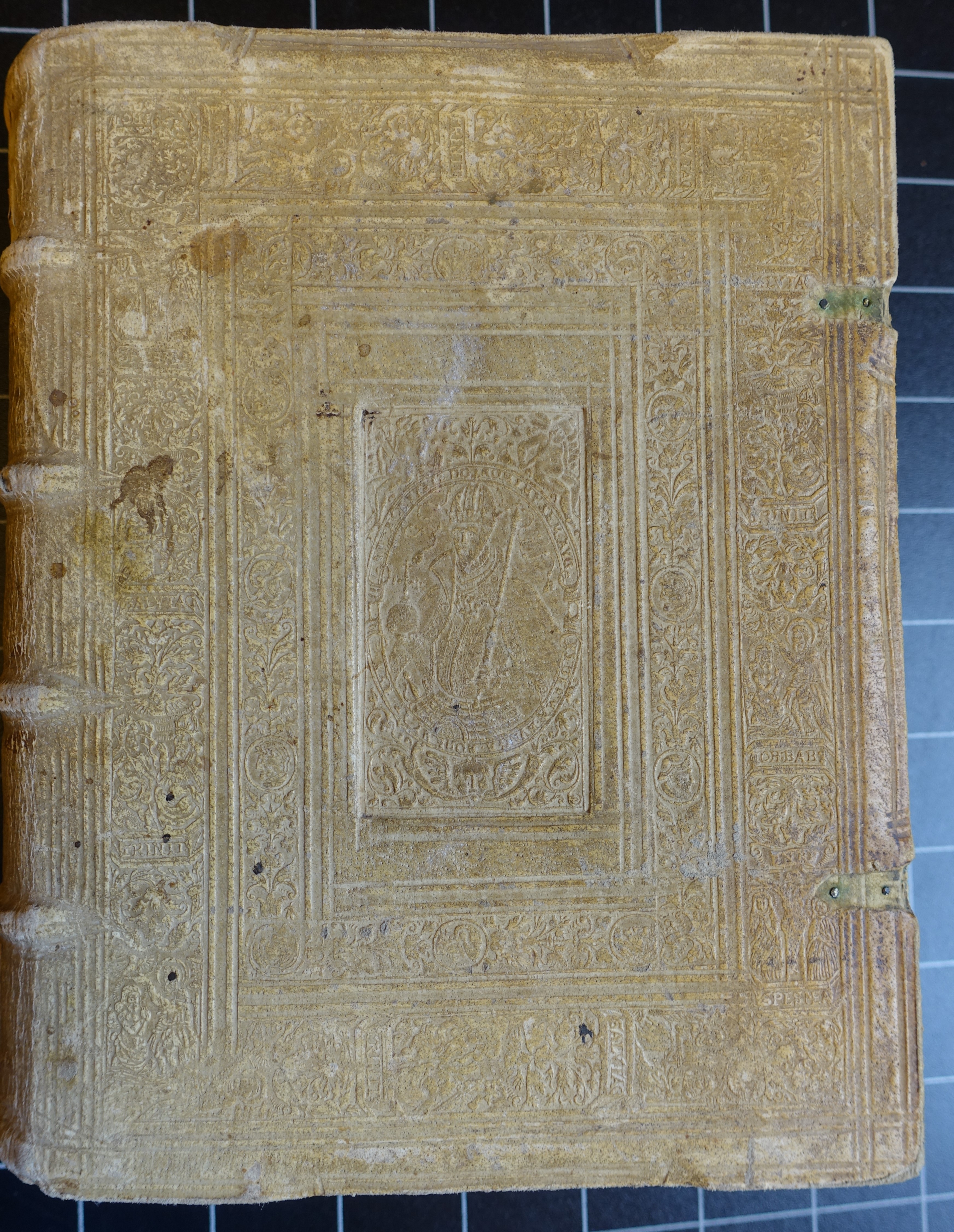 Prkénková potažená světlou usní zdobenou slepotiskem, centrální plotna s vyobrazením císaře Rudolfa II. z díly Knihvazače rudolfínského okruhu I (NUSK 81, číslo nářadí NUSK P 000 788), zadní plotna setřelá. Stopy po sponách, na hřbetě signatura Královské knhovny ve Stockholmu a starší signarury.